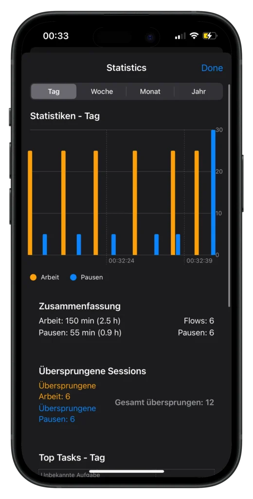 Mit PearTimer bleibst du nicht nur fokussiert, sondern steigerst auch deine Motivation durch bewusst eingeplante Pausen. Unsere intelligenten Statistiken zeigen dir auf einen Blick, wie produktiv du warst – Tag für Tag, Woche für Woche und sogar über Monate oder das ganze Jahr hinweg.