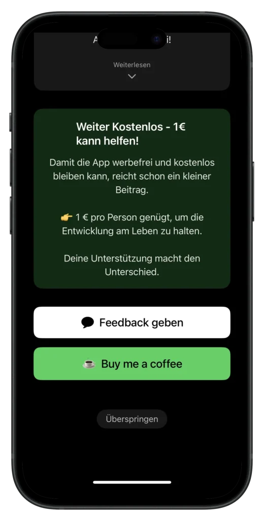Damit die App werbefrei und kostenlos bleiben kann, reicht schon ein kleiner Beitrag.1 € pro Person genügt, um die Entwicklung am Leben zu halten. Deine Unterstützung macht den Unterschied.
